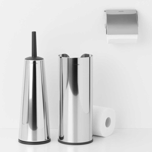 סט טואלט לשירותים מבריק ReNew ברבנטיה: דיספנסר, מתקן קיר לנייר טואלט ומברשת אסלה קונית Brabantia