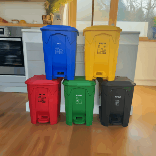 | בחירת פח מיחזור פנדה | כחול לנייר, צהוב לבקבוקי פיקדון, שחור לאשפה, אדום לאריזות, ירוק לזכוכית |